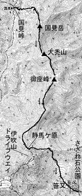 - 行程:大垣7:00=国見峠8:15~40-国見岳(1126)9:20-大禿山(1083)10:10-御座峰(1070)10:50~12:00-静馬ケ原13:20-笹又(さざれ石公園)15:00=大垣16:10