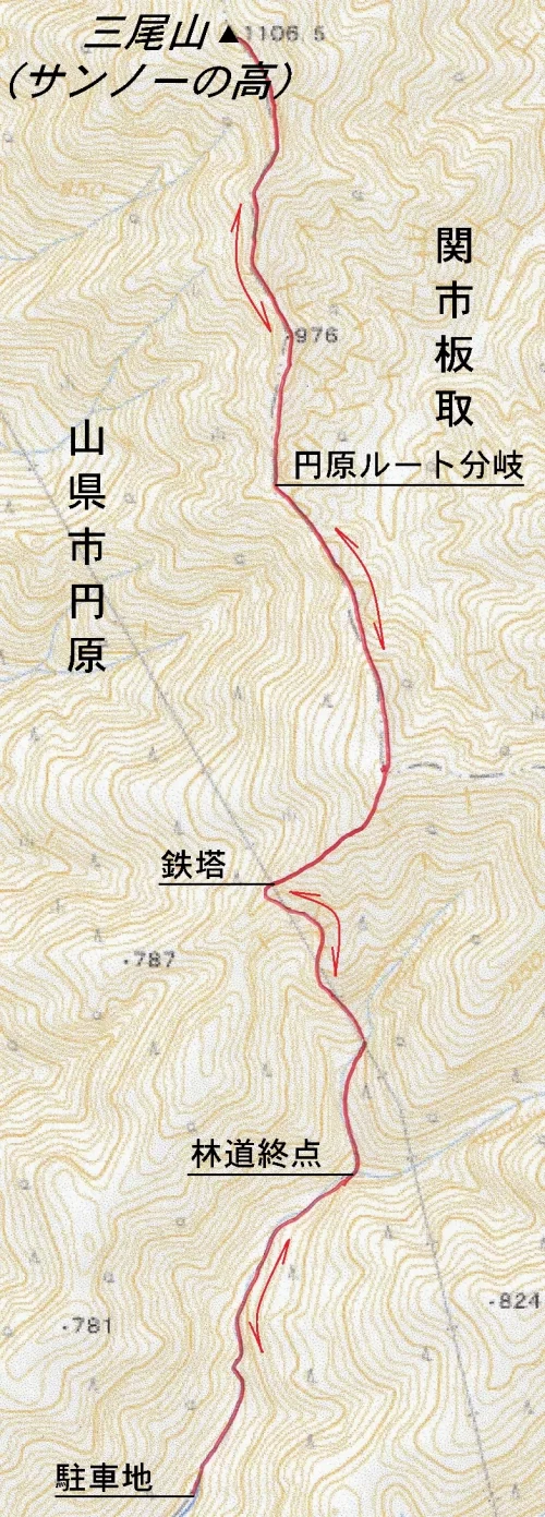山頂はさほど広くなく展望もありません。三尾山(みおさん)は山県市と関市に跨る二等三角点峰で、山頂には「サンノーの高」という別名の表示板がありました。