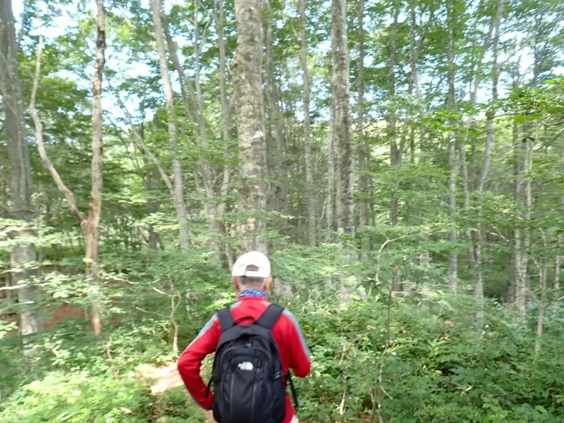 再び樹林帯に入り、少しのアップダウンを越えると見事なブナ林が現れ、見ているだけで清涼感がありました。ここで小休憩。