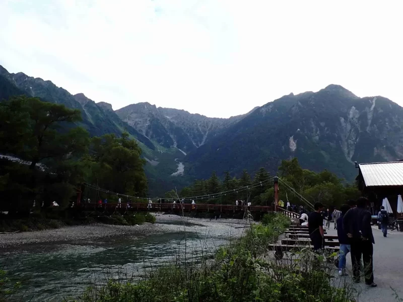 河童橋の中央右奥が目指す前穂高岳 早朝なのに大勢の観光客
