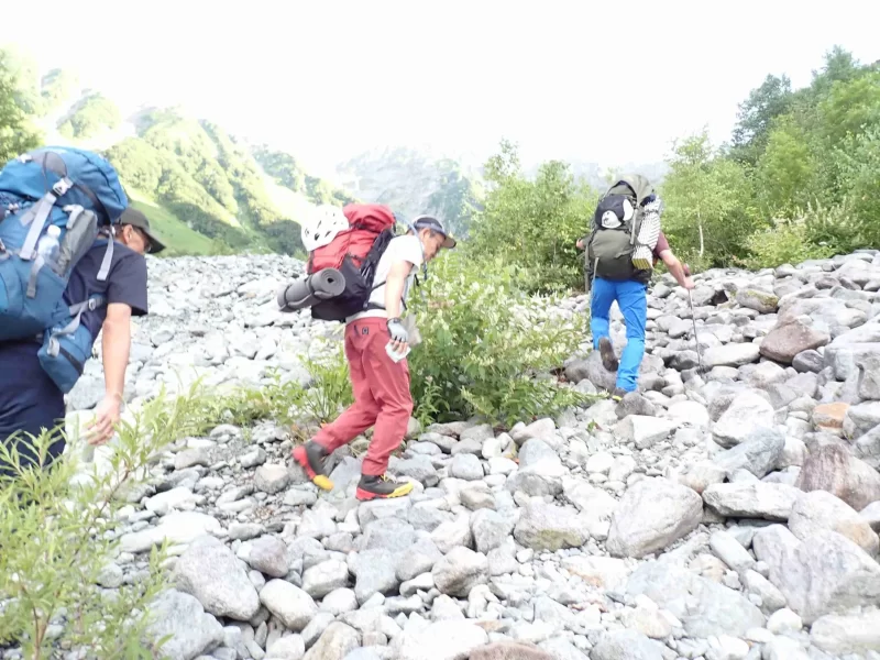 晴天が予想される1日目メインの計画は、まず岳沢小屋を目指しテント設営、身軽な状態で前穂高岳を往復するものだ 行程は、距離13.3km 登り1,550m 下り900mで、結果的に休憩除き7時間の歩きになった