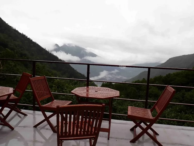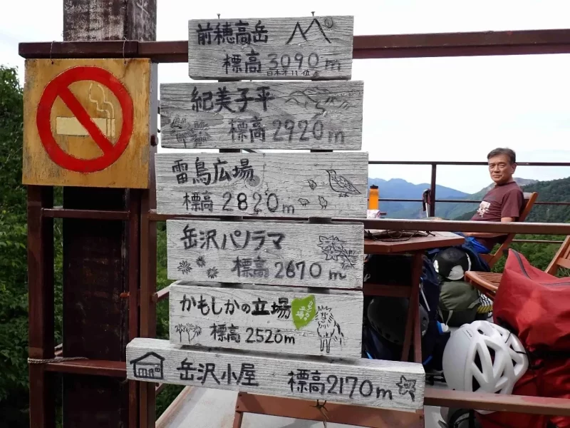 河童橋から2時間15分で岳沢小屋到着。テラスで休憩しながら、この先のポイントを確認