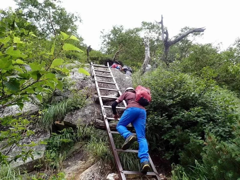ハシゴや鎖が続くかなり等高線が混んだ登りを10分あまり
