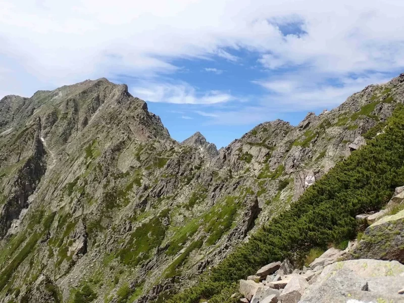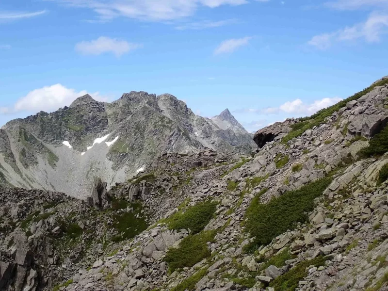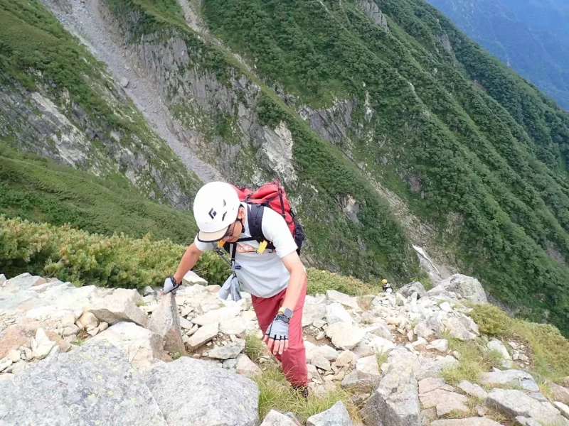 次のポイント目指してガレ場の急登を一休みしながら進む まわりの景色で高度感満天