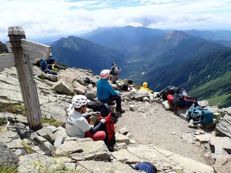 多くの登山客がここに荷を置き往復1時間の前穂高岳まで登る