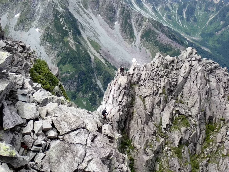 槍ヶ岳をバックにすぐ手前でクライマーを発見 見事に懸垂下降されていた