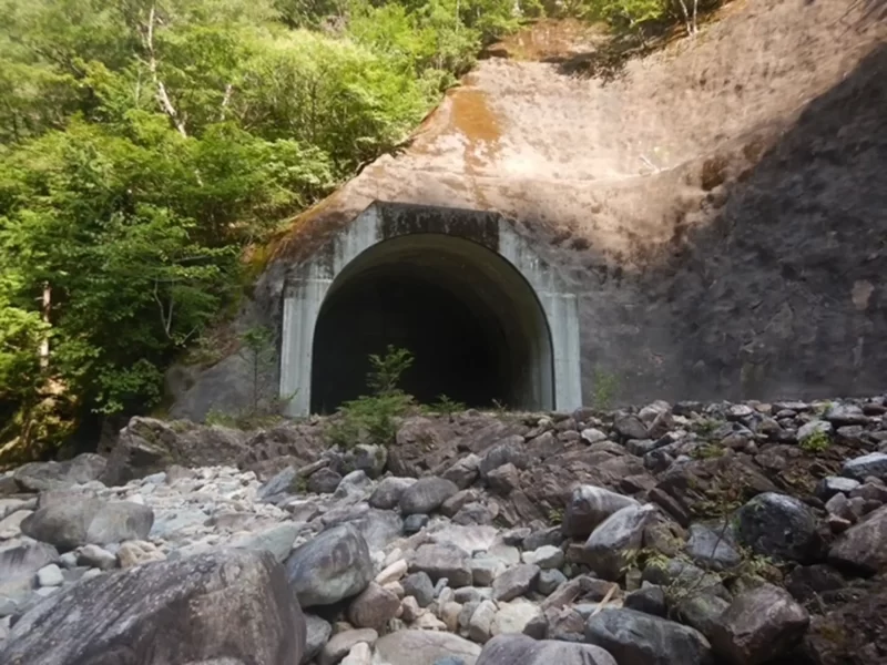 この谷にダム建設が計画された際つくられたトンネルだ。