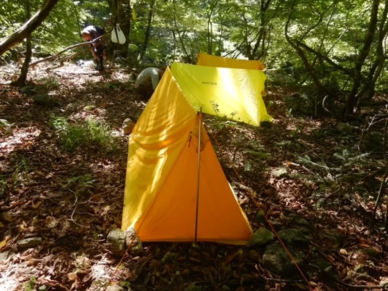 樹木を縫うようにして3人三葉のやり方でツェルトを張った。