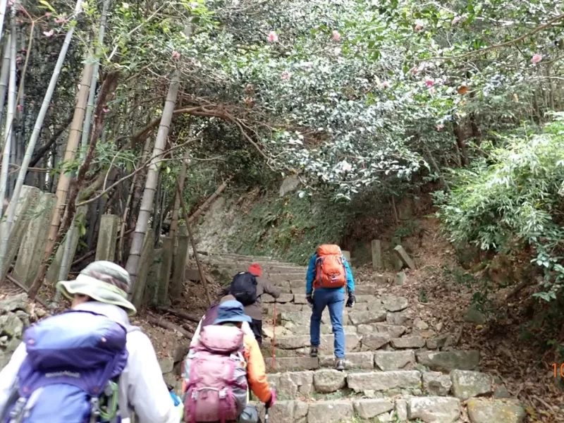 長命寺808段の名物石段であるが不揃いの段差が意外に高く太ももにグッと負担がかかる。