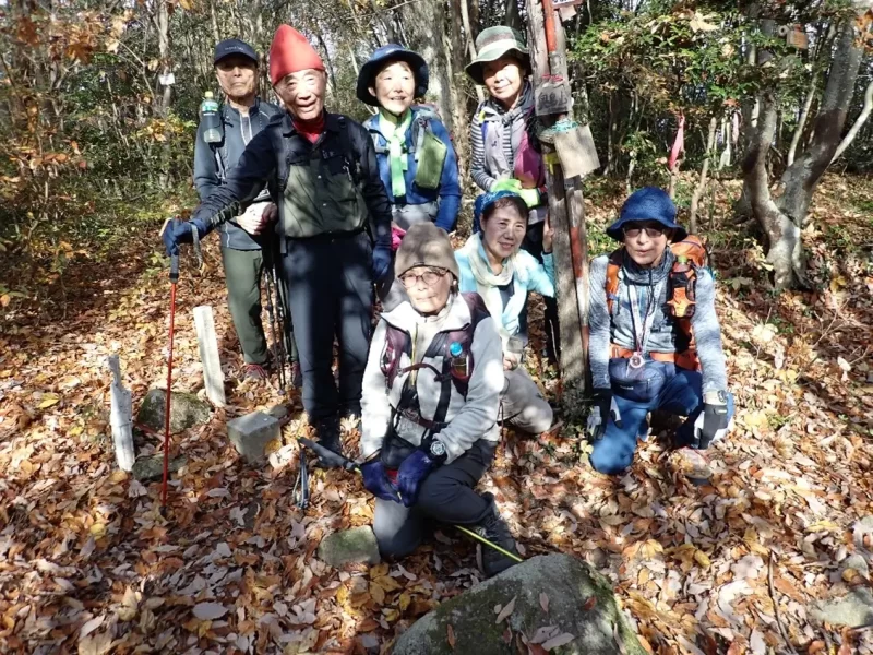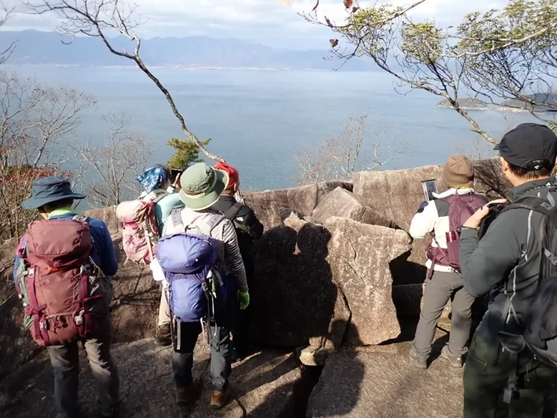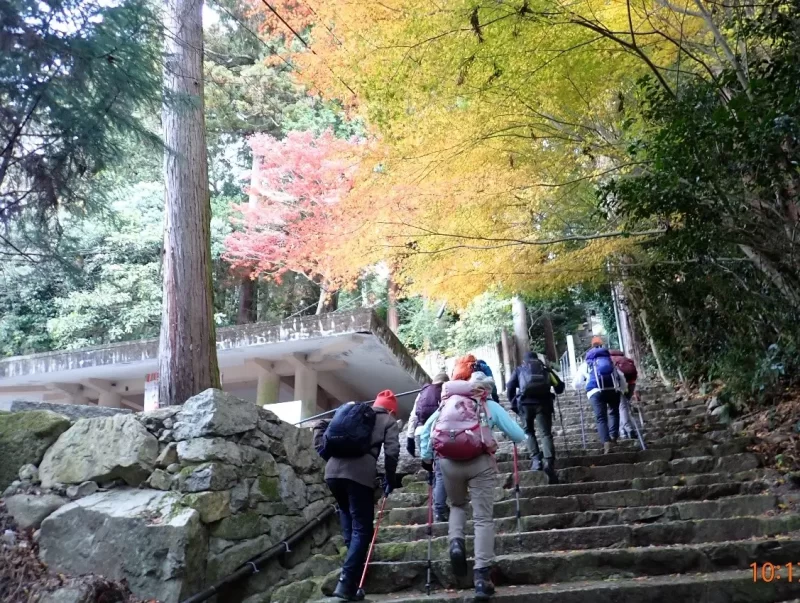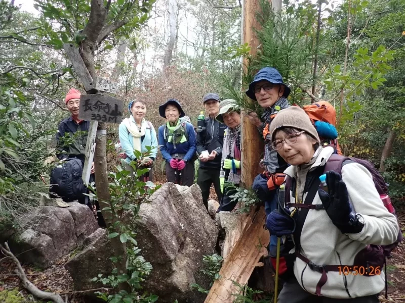本年最後の週日山行はMY.Lの下8名の参加で琵琶湖の南岸、近江八幡市長命寺町から808段の石段登って長命寺へお参り、その後に長命寺山333mを経て奥島山424mへ登った。山頂直下の展望岩からは琵琶湖西岸の比良や高島の山々を見渡し絶景に見とれた。