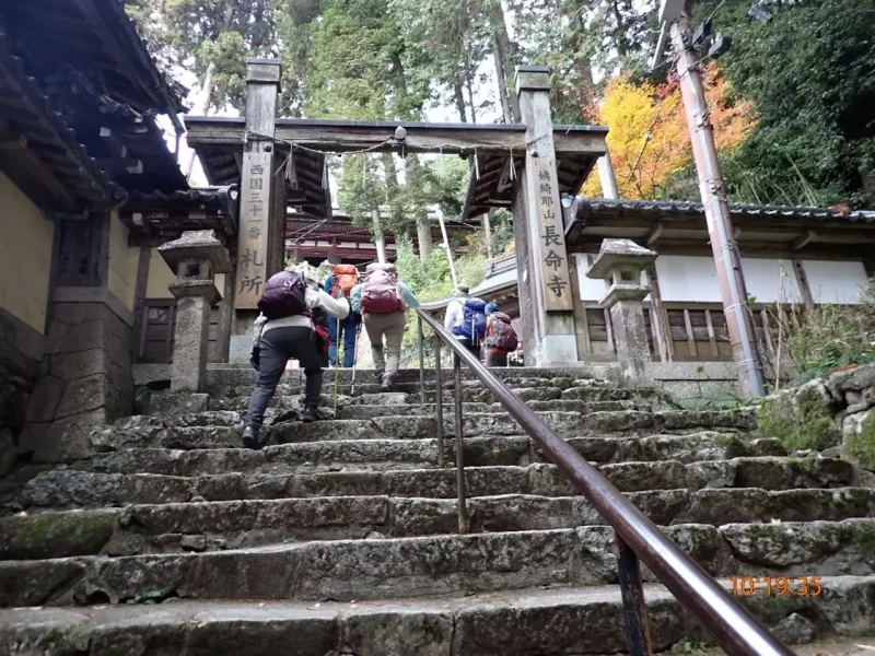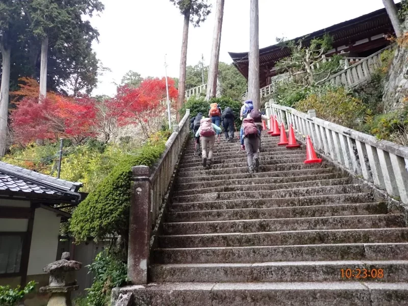 騙された、本堂広場はこれを登ってもう一度右に折れて登りきった所のようだ。本堂の屋根と赤く色づいたモミジが手招きしているが上げる一歩の足が重たい。