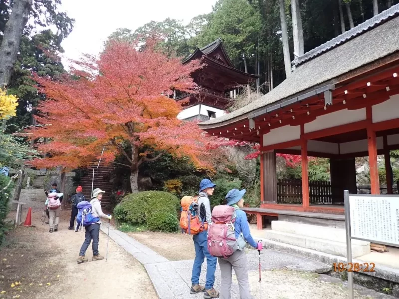 下から仰いでいてこの建物が本堂と思い込んでいたが八合目駐車場で甘かった。階段はまだ上へ延びており気は萎える寸前、薄日に映えるモミジが綺麗で癒された。