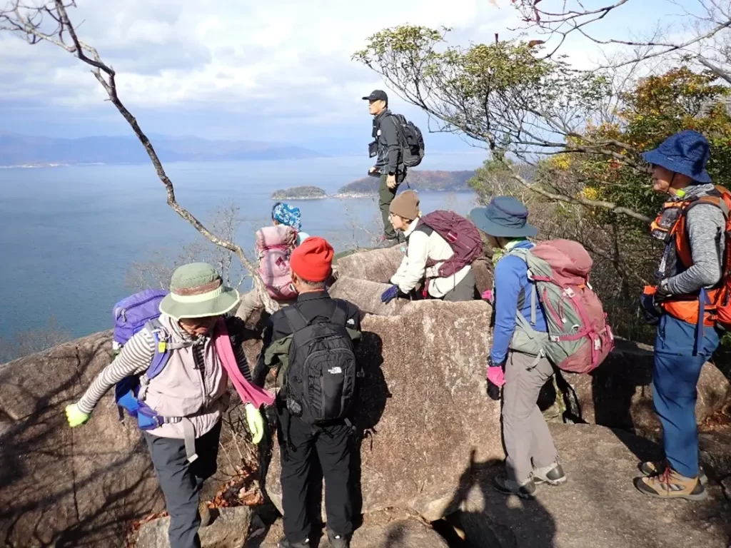 本年最後の週日山行はMY.Lの下8名の参加で琵琶湖の南岸、近江八幡市長命寺町から808段の石段登って長命寺へお参り、その後に長命寺山333mを経て奥島山424mへ登った。山頂直下の展望岩からは琵琶湖西岸の比良や高島の山々を見渡し絶景に見とれた。