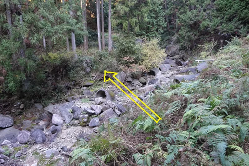 しばらく林道を進むが、川を渡る部分が流され、川床に降りて対岸に渡る。