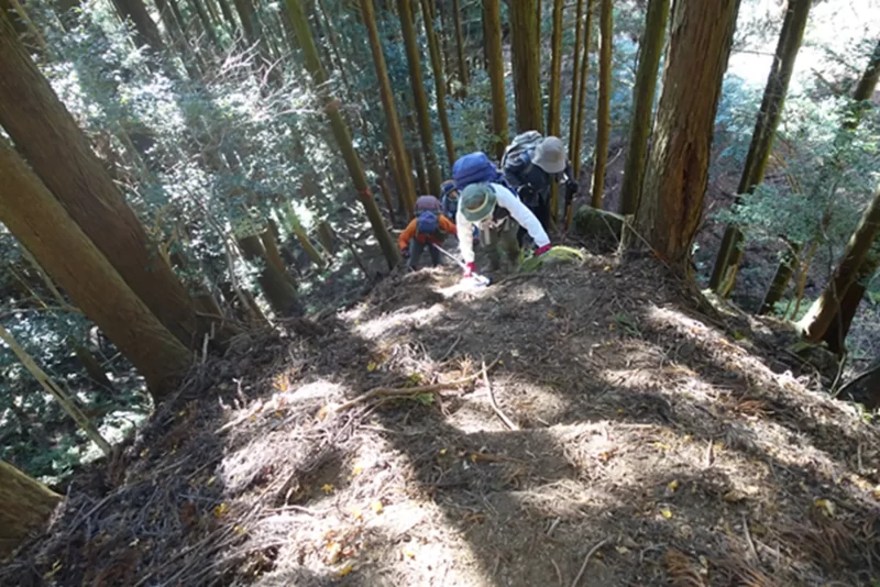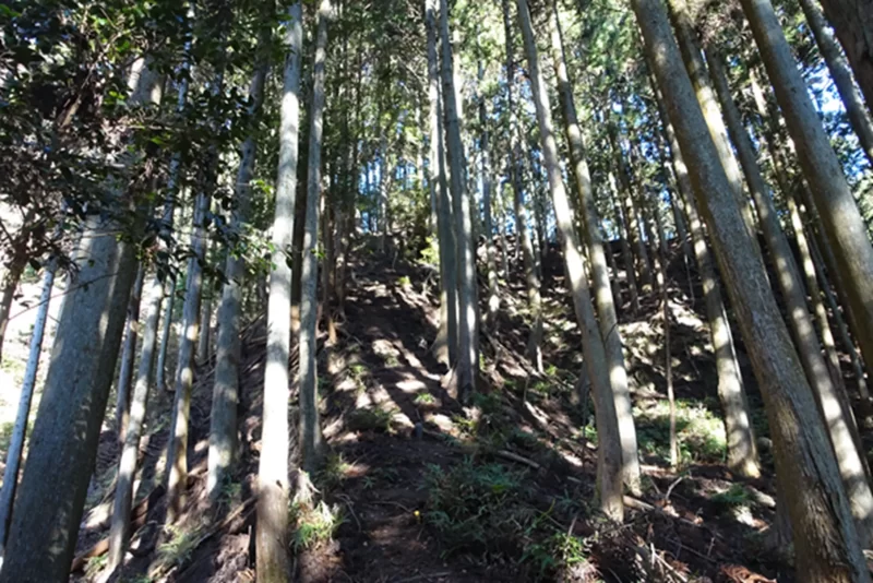 良く手入れされたスギの植林の中の胸を突くような急登がはじまる。
