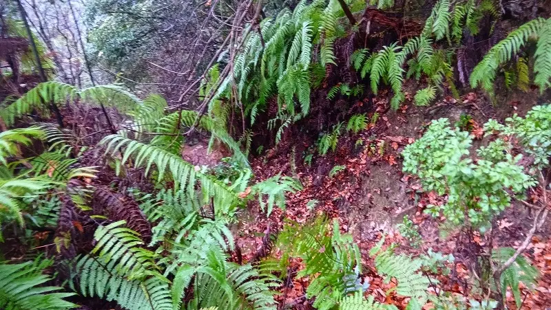 太神不動道は落ち葉が降り積もって歩き易く、周りを見渡すとお正月に飾るウラジロが大群生して他の植物が見当たらないほど占領されて独特の雰囲気だ。一時やんでいた雨がまた降ってきて急いで雨具を身に着けた。