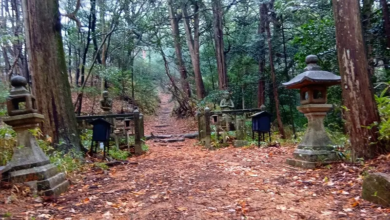 不動橋を渡ってから修験道の寺であった不動寺にいく参道らしき道を登ると、樹木の隙間から瀬田の町を望むことができ、堂山方面も展望できた。参道を進むと真っすぐに伸びた刀を右手に挙げている迎え不動がありここは、堂山への分岐にもなっている。ざれた花崗岩の岩道は雨で濡れているので滑らないように細心の注意を払う。