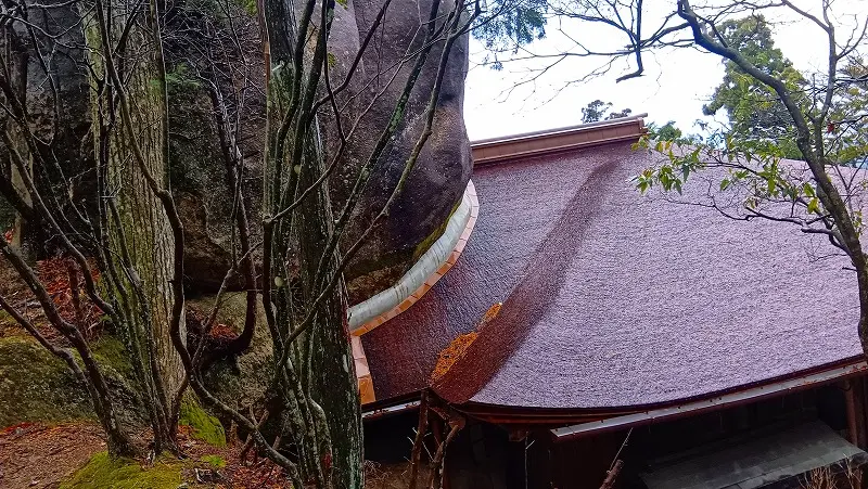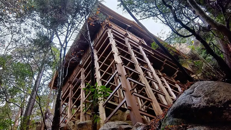 巨岩の急斜面に柱を伸ばして造られた建物でこんな山の奥に本堂を造った先人達の苦労が偲ばれる。