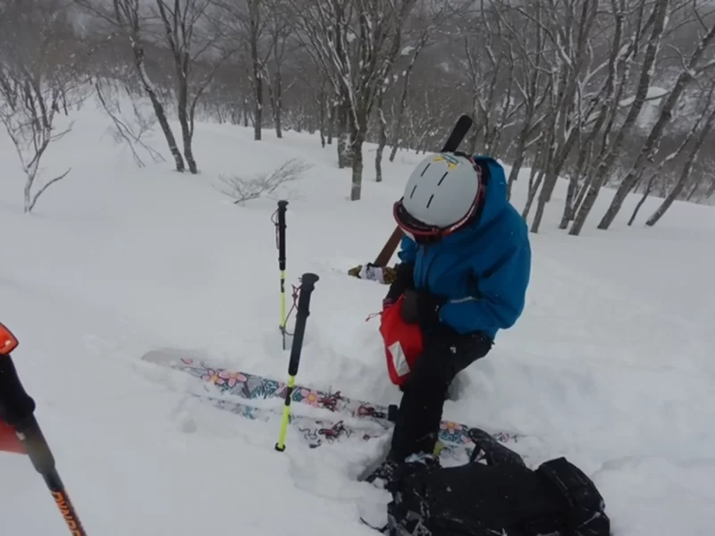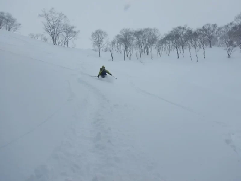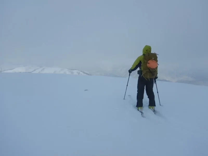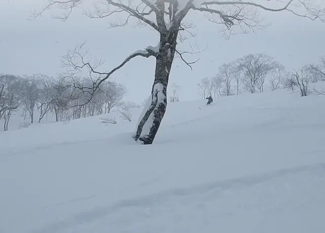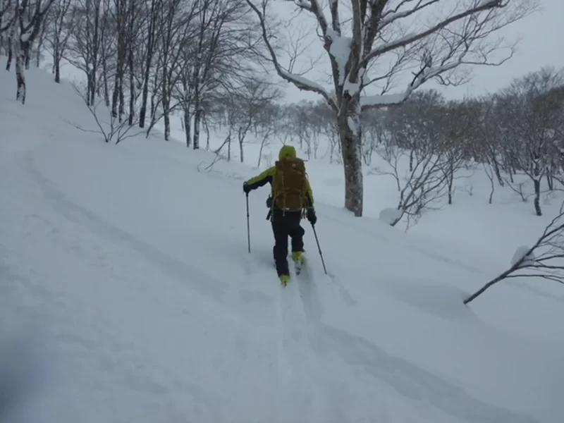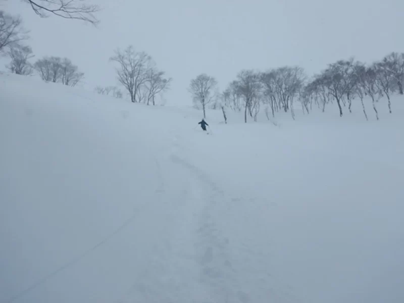 見た目はいい雪面だったが歩いてみるとクラスト気味の雪の上に新雪が載っている状態。