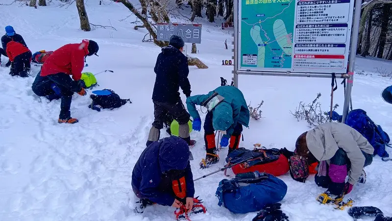 8合目付近840mの聖宝寺分岐からは急坂になるので多くの登山者がアイゼンを装着していた。私達もここでアイゼンを履いた。手袋を外しての装着作業は早く行わないと指先の感覚が無くなるほど冷たく、立ち止まっていると一気に体温が奪われて寒い。