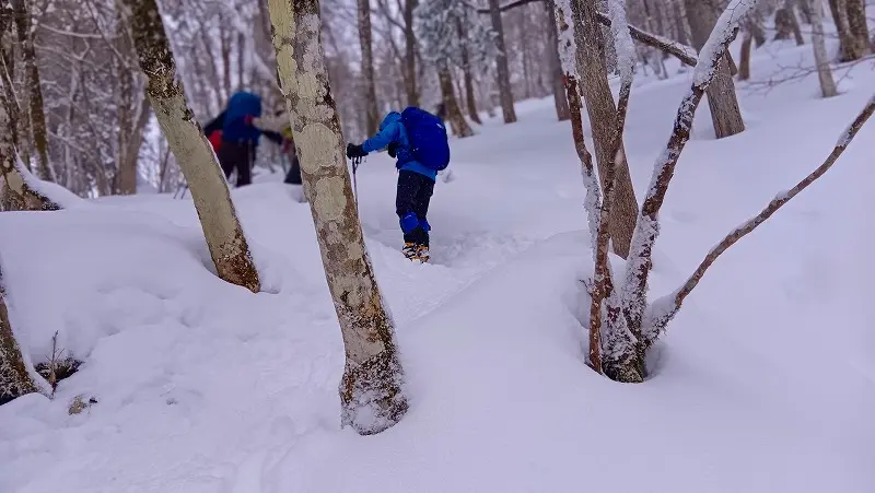 トレースはあるものの、雪は綿菓子の様にふかふかだ。各自好きな所をラッセルして雪遊びを楽しんだ。ワカンに履き替えたほうがいいのだがが藤原山荘も近いしそのまま突き進んだ。