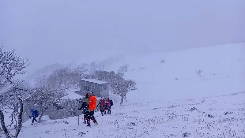 足先も手先も凍える寒さだ。山荘からみる山頂方面は真っ白で山頂までいけるかと思ったがまずは山荘で暖を取ろう。