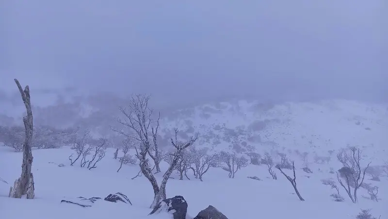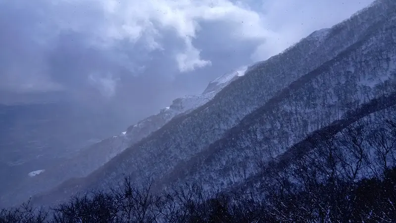 8合目辺りからまた雪雲に覆われて雪も降ってきたが、樹林帯に入れば風もや和らぐ。