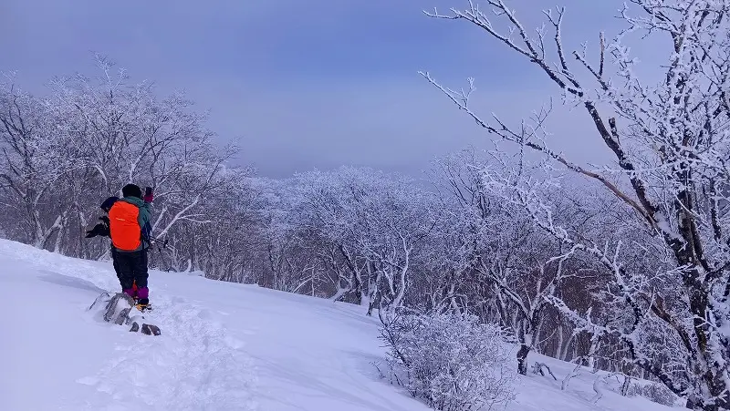 帰りの冬道は、アイゼンを効かせて兎のように爽快に駆け下りた。この斜面ではスノーシューがあればもっと快適だと思った。