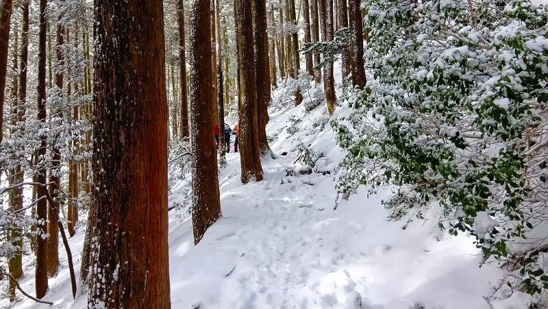 杉林の緩やかな斜面を経て2合目の急坂を登りきると4合目の広い休憩所に到着した。積雪はこの辺りで5cmほどで地面は凍っておらず歩きやすい。厚着をしていたため汗をかき衣服調整をして先を進む。