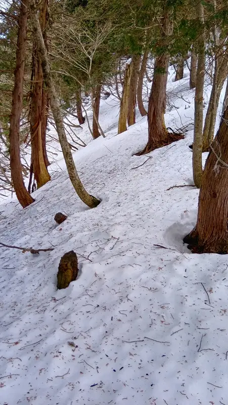 積雪は20cmほどある。雪面は硬いのでツボ足で歩けそうだ。