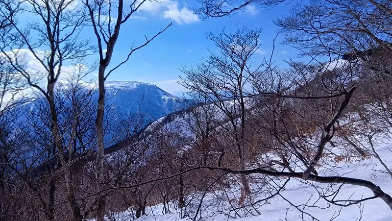 この辺りからブナ林が広がり樹木の間から真っ白な伊吹山を望む事ができた。