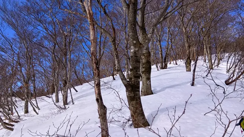 ブナ林の緩やかな斜面を登りきると周囲が一気に開けた。地図とGPSで確認すると北に向かわなければならないポイントである1171m地点に着いた。