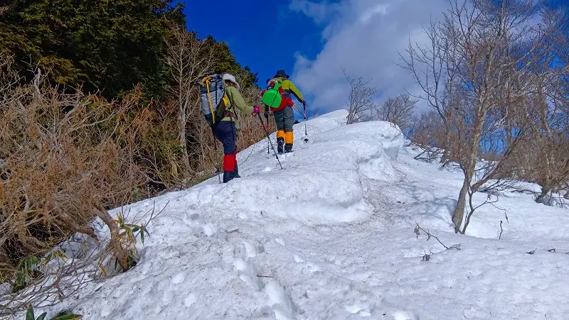 急坂のラッセルは交代でこなす。硬い雪を蹴り込みながら進むが、時折足が抜けてバランスを崩した。980m付近まで登ると斜面は少し緩やかになった。