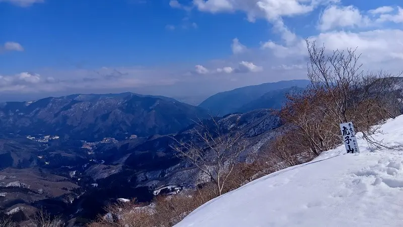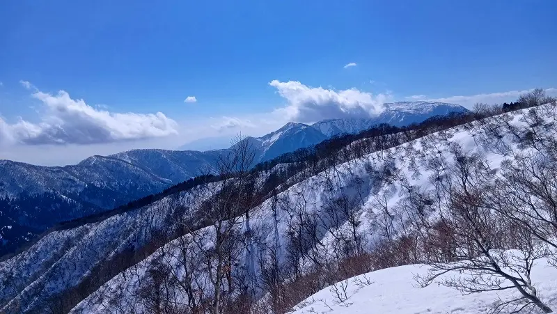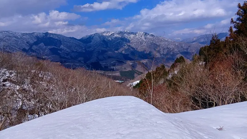 山頂はラッセルをして頑張った我々だけの貸し切りで絶景を眺めながらのランチを楽しんだ。山頂は暖かくこの陽気ならあと数週間で雪も消えてしまうだろう。3月1日には揖斐の湧谷山山行が計画されているが、さらに雪は緩んでいるかもしれない。