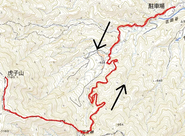 • 行程:475m付近駐車場7:10~7:20→国見林道舗装道路取り付き7:25→国見峠9:15→978m地点9:50→1171m地点10:40→虎子山11:10~11:55→国見峠12:50→駐車場14:10