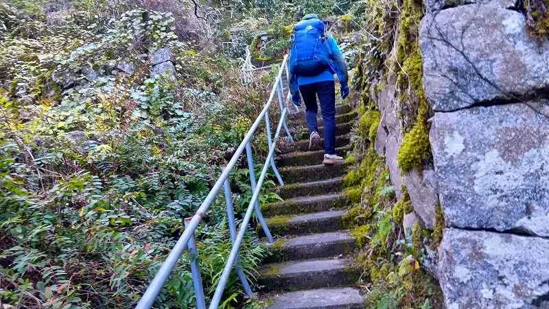 この登山道はかなりの急坂だが、振り返り北を望むと尾鷲湾のリアス式海岸が青く輝き美しい。