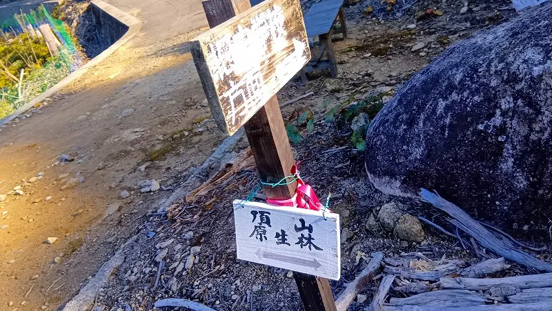 集落が途切れると鬱蒼とした山道になるが山側には石積みが続いてかつてここに人々が生活していた痕跡が残っていた。暫く雑木林の道が続いた後、風景が変わり整備された林道にでた。案内にしたがって先ずは頂山の原生林方向に進んだ。