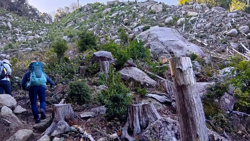 <以前は沢山の杉が植えられていたようだが伐採された登山道>