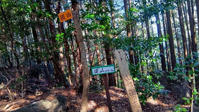 鬱蒼と生い茂った林の中を下り再び緩やかになった所に二等三角点のある頂山の山頂に到着した。