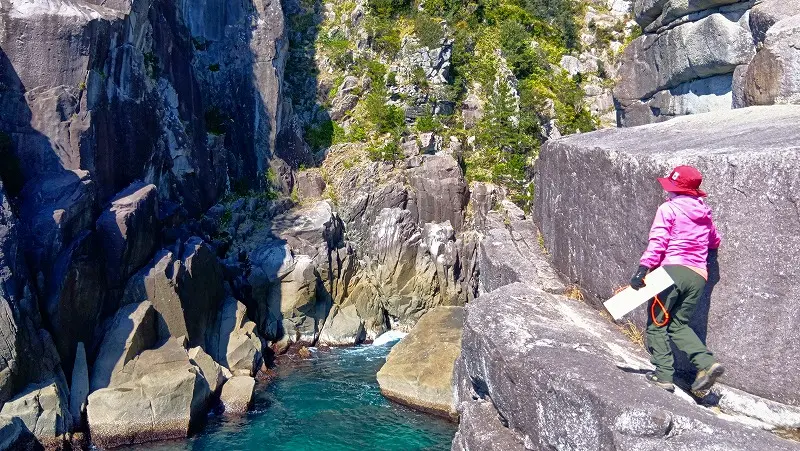 潮の香りが漂い始めして急傾斜の沢を下ると